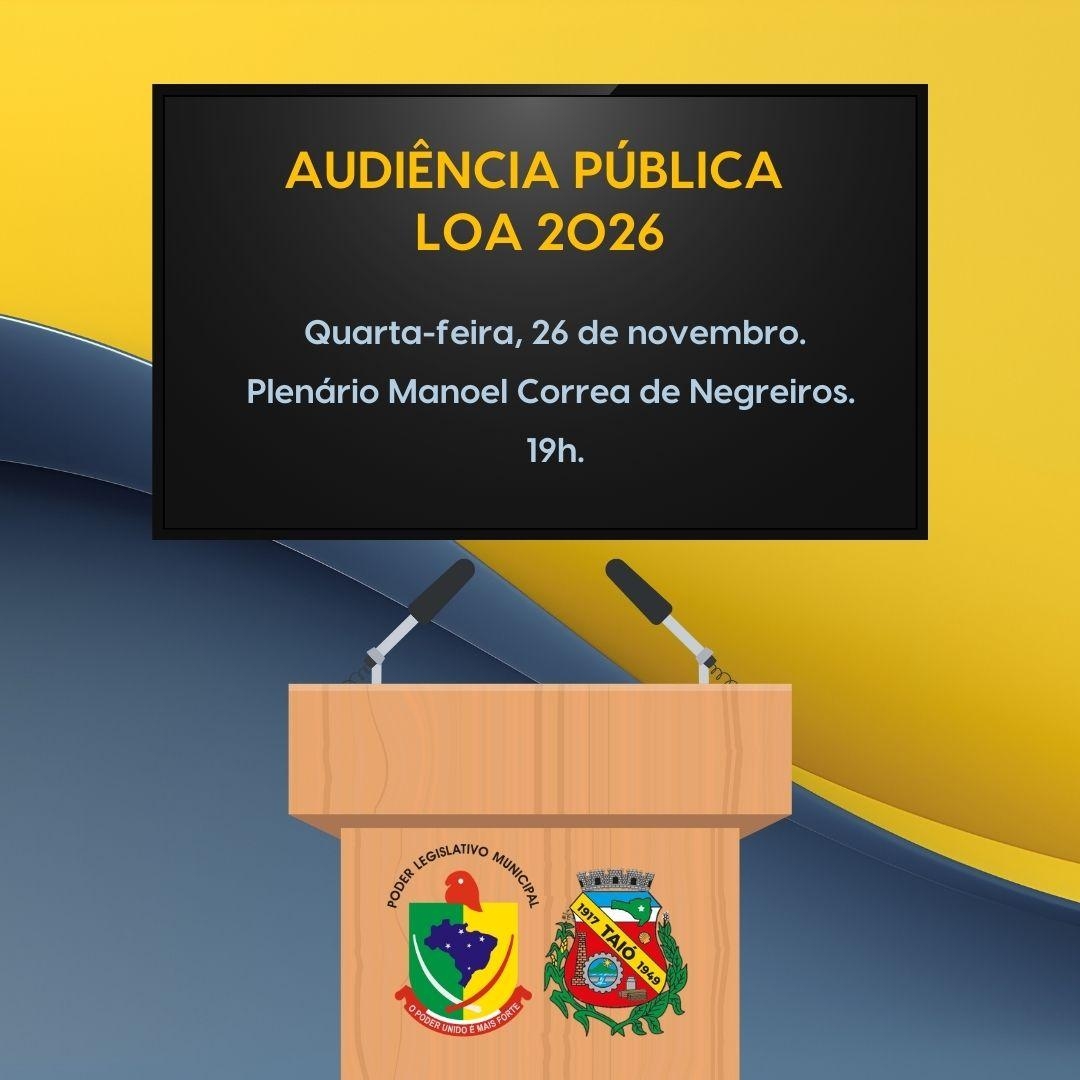 Nesta quarta-feira, 26 de novembro, a Câmara de Vereadores de Taió realiza Audiência Pública da Lei Orçamentária Anual (LOA 2026). O evento é destinado a entidades civis, associações, servidores públicos e comunidade em geral. A audiência iniciará às 19h no Plenário Manoel Correa de Negreiros (2º andar).